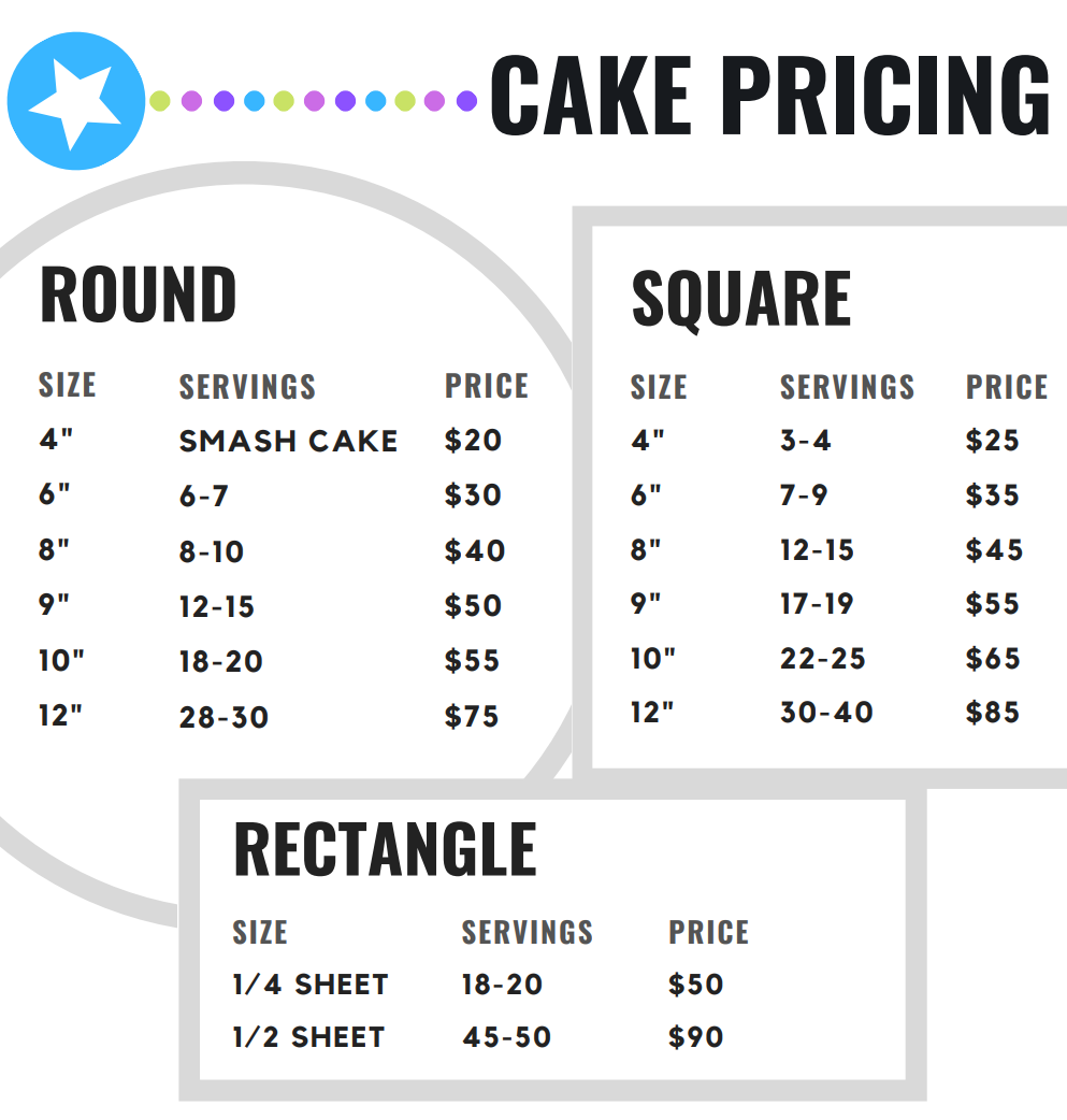 CAKE PRICING INCLUDES SIMPLE WHIMSY DECORATION, WRITING, AND COLORS.